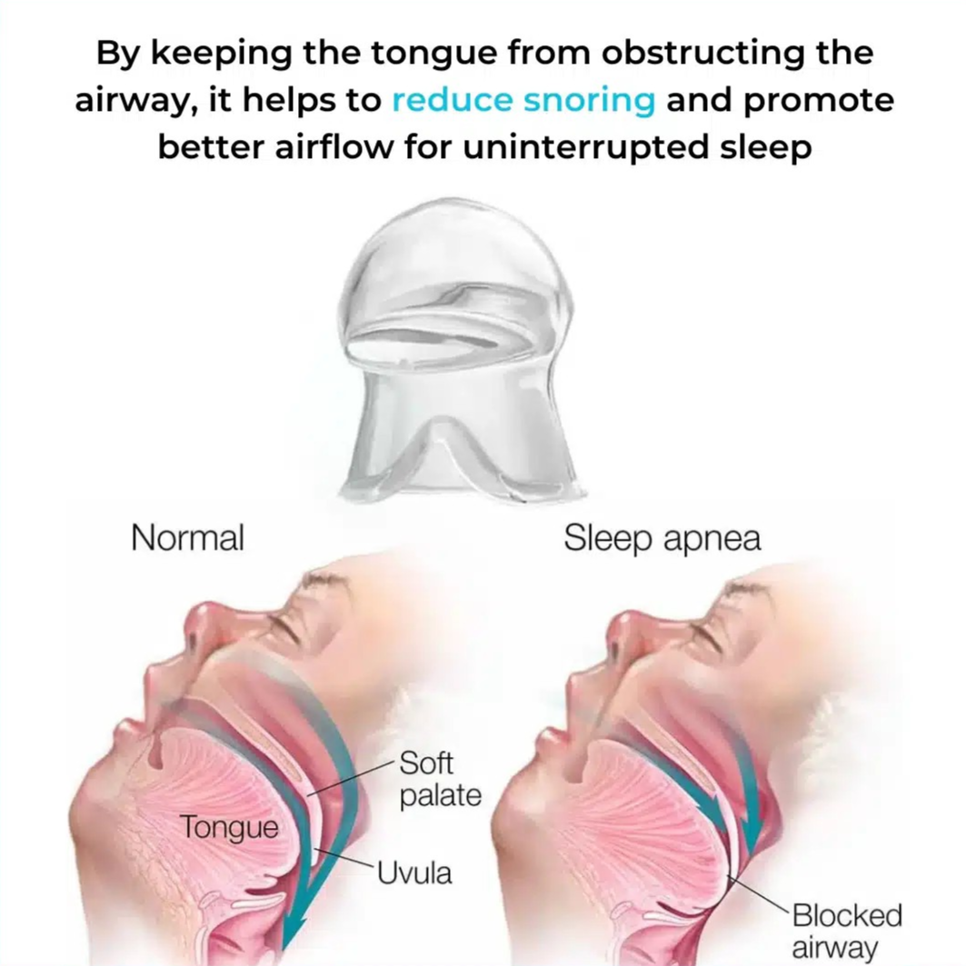 This feature holds the tongue in place, preventing it from falling back and obstructing the airway, a common cause of snoring and sleep apnea.